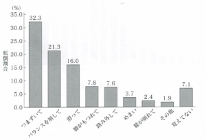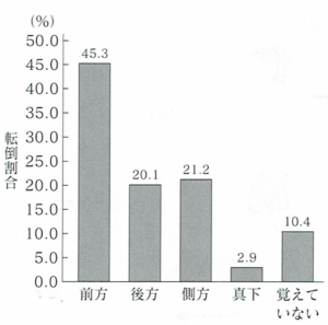 ・最も多いのは「前方への転倒」45.3%、ほぼ同率で「側方への転倒」21.2%、「後方への転倒」20.1%であった。