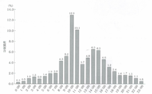 ・午前10時~正午にかけて突出して多く、夕方にかけて緩やかに減少している。