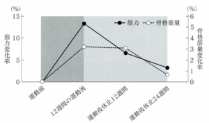 12週間のレジスタンス運動を行い、その後24週間の運動休止期間を設け、筋力・骨格筋量の推移をグラフにした。